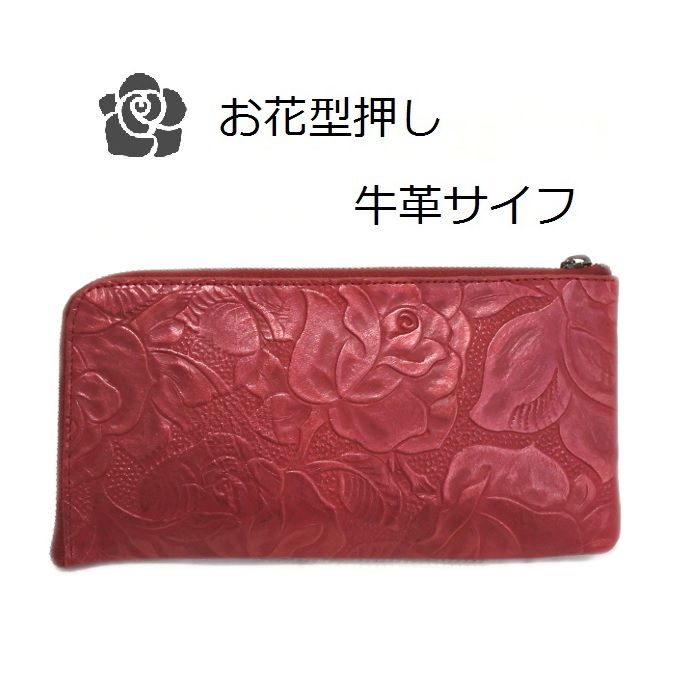 牛革レザー L字ファスナー 長財布 新品 レッド レディース 薄くてすっきり収納 ボタニカル 花柄